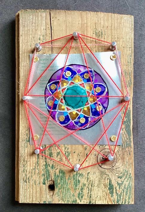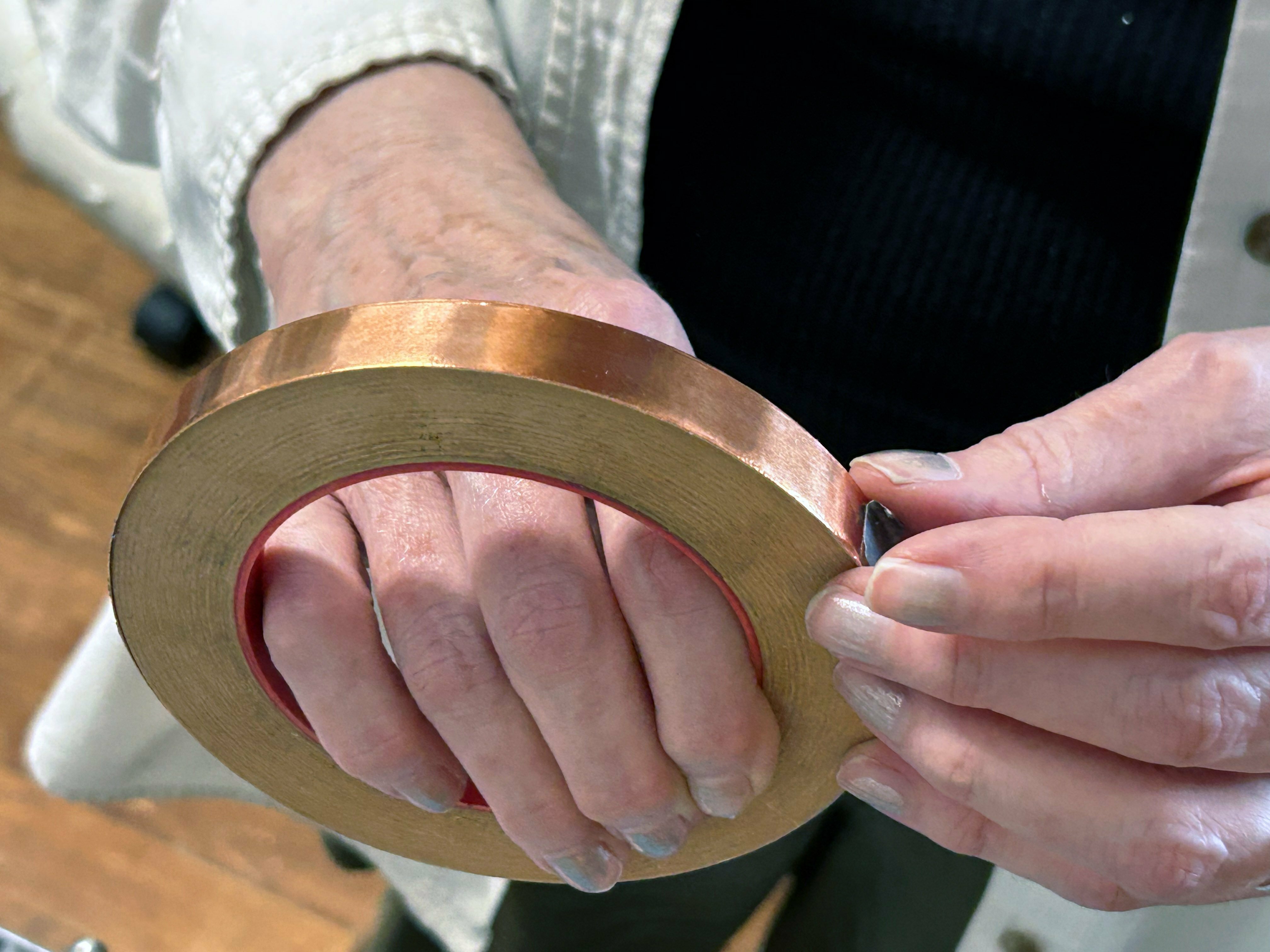 This is copper tape, with one side adhesive. If you’re thinking of going to the hobby store for a project, consider going to the hardware store first. You might find something that is really unusual that inspires you, and lets you do something nobody else is doing. I go to Ace Hardware down the street and buy screws and tacks and things. Some screws have heads that are 6-pointed-star. You’ll see them in my work.