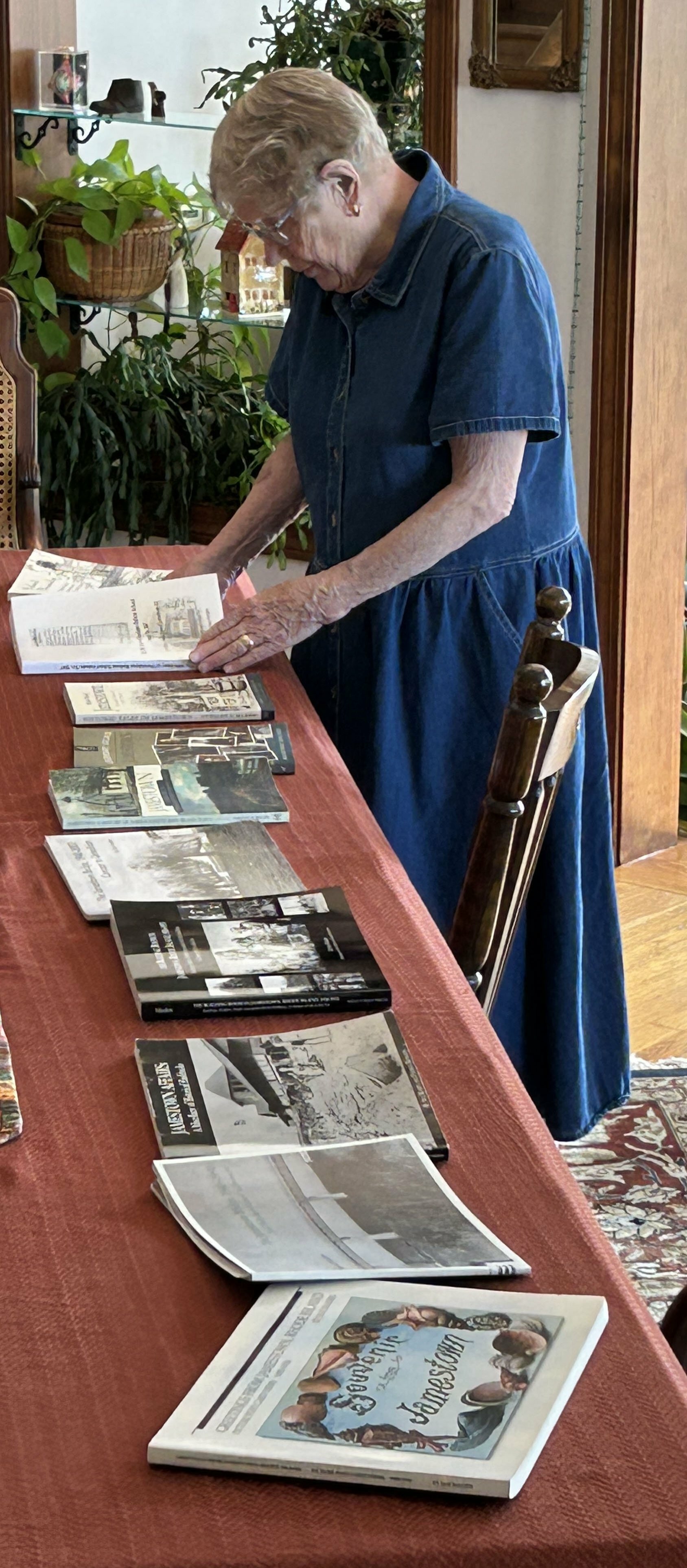 “Groups go like this,” she said, tracing a downward curve in the air. “But the Historical Society has been going like this.” She reversed the motion in a hopeful arc. Thanks to years of dedication, the Jamestown Historical Society is thriving. “We redesigned our website not long ago. It’s really fabulous. We have about 70,000 items in the collection, all available online, including my postcard collection.” The Jamestown Garden Club, still active, provides fresh flowers each week for the museum. “It’s one of those little touches that keep the place alive,” she smiled.