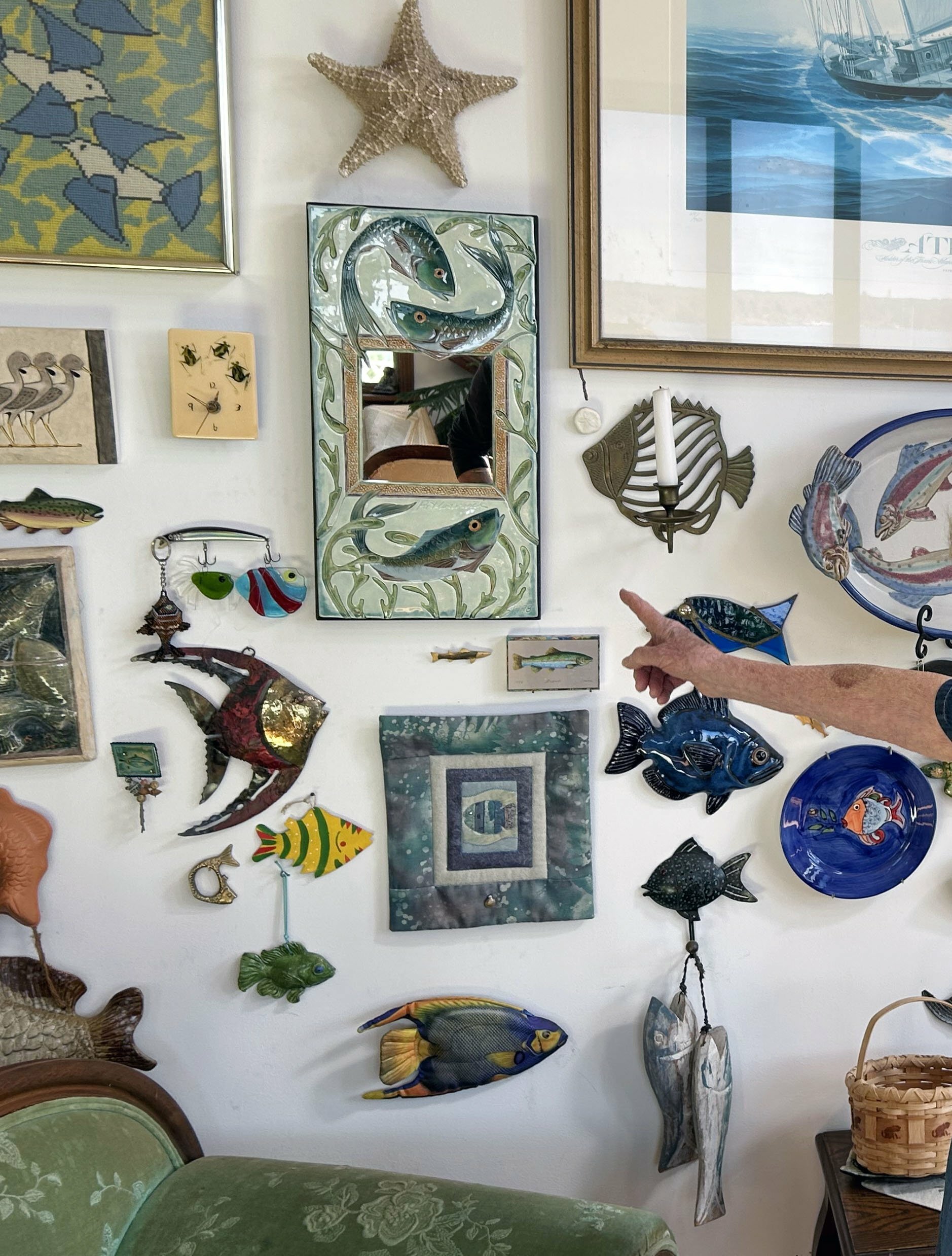 Sue’s love of collecting extends into her home. On one wall hangs her “marine collection,” a shimmering array of ceramic fish by local artist Julian Barber and others. Nearby are maps and tiles depicting the island she has spent half her life chronicling.